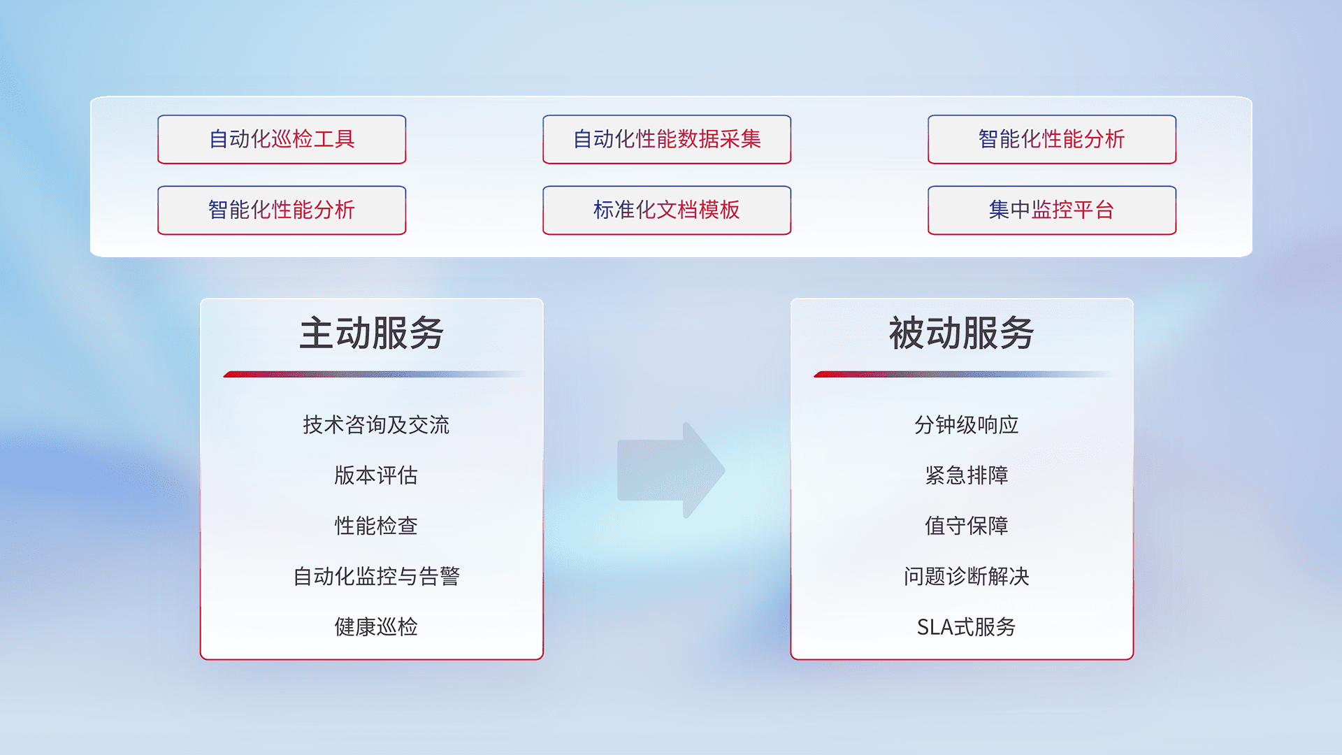 智能化工具和标准化文档,,,保障服务质量,,,提供主动服务(包含技术咨询、、版本评估、、、性能检查、、、、自动化监控与告警、、健康巡检)和被动服务包含(分钟级响应、、、、紧急排障、、、值守保障、、、、问题诊断解决、、、、SLA服务)。。。。