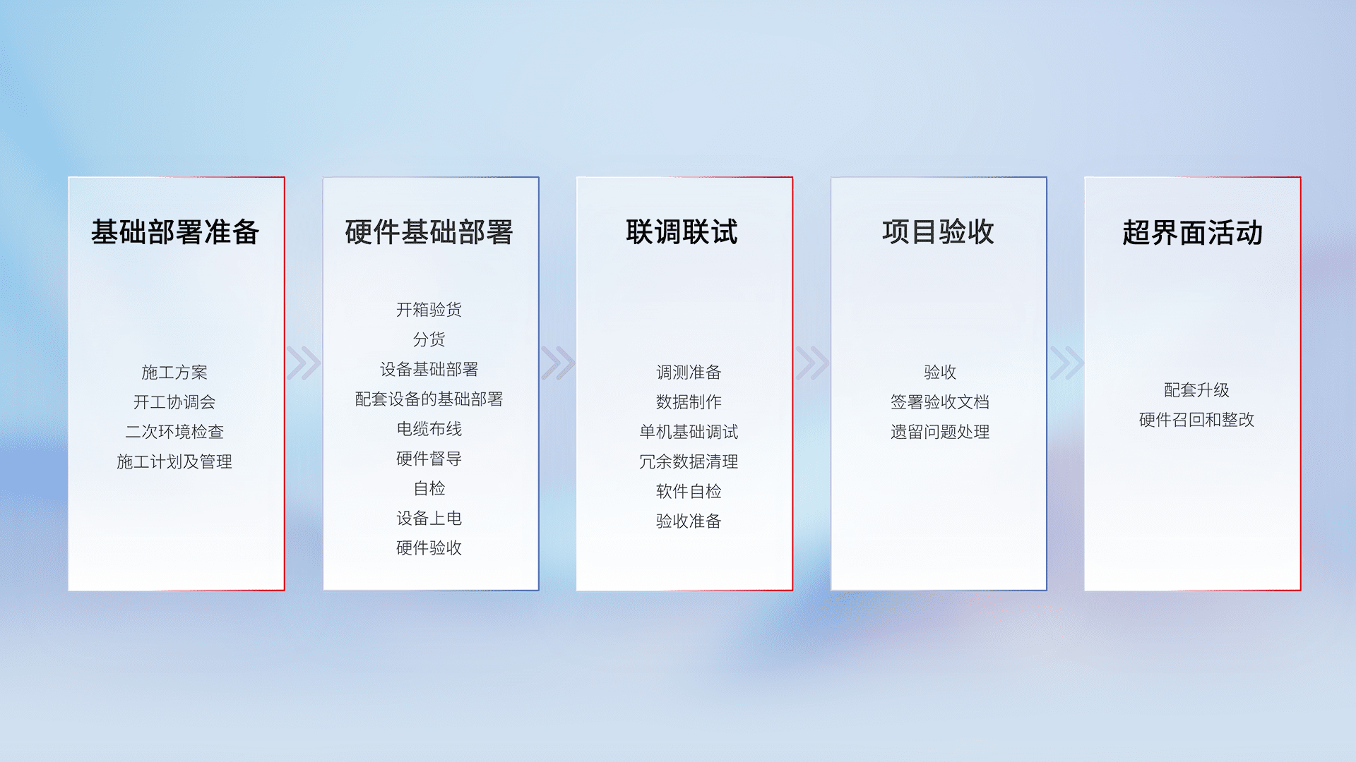 从基础部署准备、、硬件基础部署、、、、联调联试、、、、项目验收、、、越界面活动的全过程可追溯,,,保证施工质量和进度。。。。